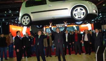 Tüzmen, Auto Show 2006 Fuarı’nın en çok ilgi çeken şovu olan uçan otomobil Skoda Roomster‘ı havaya kaldırarak basın mensuplarına ve ziyaretçilere poz verdi.
