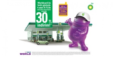 BP ve Yapı Kredi işbirliği ile başlayan yeni kampanyada, 15 Ocak 2014 – 28 Şubat 2014 tarihleri arasında Yapı Kredi World üyesi BP istasyonlarından farklı günlerde 4 kez, tek seferde 75 TL ile üzeri akaryakıt veya otogaz alışverişi yapan Worldcard’lılar, 01-10 Mart 2014 tarihleri arasında bir daha World üyesi BP istasyonlarından minimum 30 TL akaryakıt/otogaz alımı yaptığında 30 TL ekstre indirimi kazanacak. Kazanılan indirimler kampanya bitiminden sonra 18 Mart 2014 tarihine kadar kredi kartlarına yansıtılacaktır.