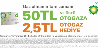 BP’nin başlattığı yeni otogaz kampanyası kapsamında 8 Mayıs – 15 Temmuz 2014 tarihleri arasında kampanyanın geçerli olduğu BP istasyonlarında 50TL ve üzeri otogaz alımı yapan BP Club Card sahipleri 2.5TL değerinde BP Club puanı kazanacak. Kazanılan puanlar 15 Ağustos 2014 tarihine kadar tüm BP Club üyesi istasyonlarında otogaz alımında kullanılabilecek.
