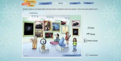 http://bit.ly/BenBegendimSanatOldu adresine Facebook hesapları üzerinden bağlanan takipçiler, Mercedes-Benz Türkiye Facebook sayfasını takip etmeye başladıkları andan itibaren ağırlıklı iletişime geçtikleri paylaşımları, eğlenceli bir galeri ile hatırlama fırsatı yakalıyor. Mercedes-Benz Türkiye Facebook sayfası takipçileri, kişisel galeri sayesinde dünyanın en önemli sanatçılarının sanat eserleri arasında kendi beğendikleri fotoğrafları, ünlü karikatürist Selçuk Erdem’in özel çizimleriyle birlikte görebiliyorlar. Kullanıcılar dilerlerse bu renkli galeriyi kendi bilgisayarlarına indirebiliyorlar ve hatıra olarak saklayabiliyorlar.