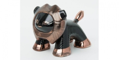 Art Toy by Christophe Pialat : “Otomobil dünyasından esinlenen çizgiler ve desenlerden oluşan bir çalışma. Aslanın yuvarlık hatlarını vurgulayan siyah ile çizgilerin keskinliğini çağrıştıran bakır rengi arasında güçlü bir tezat görüntüsü sunuyor.”