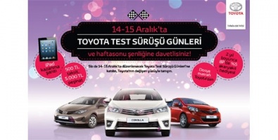 Dünyanın en çok tercih edilen otomobili Yeni Corolla, şehiriçi yolların vazgeçilmez otomobili Yaris, Toyota’nın heyecan verici yeni tasarım anlayışını ilk kez tam olarak yansıtan Auris, lüks ve prestijin simgesi Avensis’i test etmek ve yakından tanıma fırsatı bulmak için 14 Aralık Cumartesi ya da 15 Aralık Pazar günlerinde Toyota Plazalar herkesi bekliyor olacak.