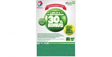 TOTAL ve Garanti işbirliği çerçevesinde, 01 Ocak-15 Şubat 2016 tarihleri arasında, Bonus ile anlaşması olan Total istasyonlarında farklı günlerde ve tek seferde 4 defa 75 TL ve üzeri alışveriş yapanlar, Bonus üyesi TOTAL istasyonlarında geçerli 30 TL Bonus kazanacak. Bonus Flaş ile kampanyaya katılanlar ise 35 TL Bonus kazanacaktır.