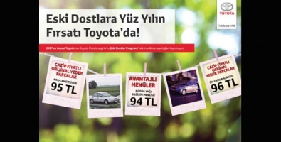 Toyota, 2007 yılı ve öncesi seçili Corolla ve Yaris modelleri için yıl sonuna kadar sürecek çok geniş kapsamlı servis ve bakım günleri düzenliyor. “Eski Dostlar” programından yararlanacak Corolla ve Yaris sahiplerini avantajlı menüler ve cazip fiyatlı yedek parçalar bekliyor. Corolla ve Yaris kullanıcıları bu programdaki büyük avantajlardan ve fırsatlardan yararlanacaklar. Bunlar arasında; Motor Yağı değişim menüsü 94 TL’den, ön fren balatasının da dahil olduğu cazip fiyatlı orijinal yedek parça menüsü ise 96 TL’den başlayan fiyatlarla sunulacak.