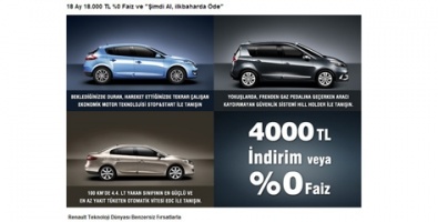 Kangoo ailesi ve Yeni Clio hariç tüm Renault modellerinde geçerli olan 18 Ay 18.000 TL %0 faiz kampanyası ile ZENGİNLİ OTOMOTİV'den Renault araç alabilirsiniz. Nakit alım tercih etmek isterseniz Fluence, Scenic ve Grand Scenic ve Megane HB modellerinde ise 4000 TL tutarında indirim fırsatları mevcuttur. Ayrıca Yeni Clio ve Kangoo ailesi hariç tüm Renault binek modellerinde geçerli olan 48 Ay 48.000 TL’ye kadar %0,89 sabit faiz ve Şimdi Al İlkbaharda Öde kampanyasından da faydalanabilirsiniz.Şimdi Al İlkbaharda Öde Kampanyasının ödeme başlangıcı Nisan 2013’tür. Stoklarla sınırlı ve 31 Aralık tarihine kadar geçerlidir.